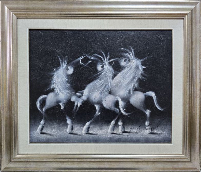 Crno beli trio III, Janoš Mesaroš, kombinovana pastel ulje tehnika, luksuzno uramljena, sa ramom 61×71 cm, bez rama 40×50 cm, sertifikat, 70800 dinara