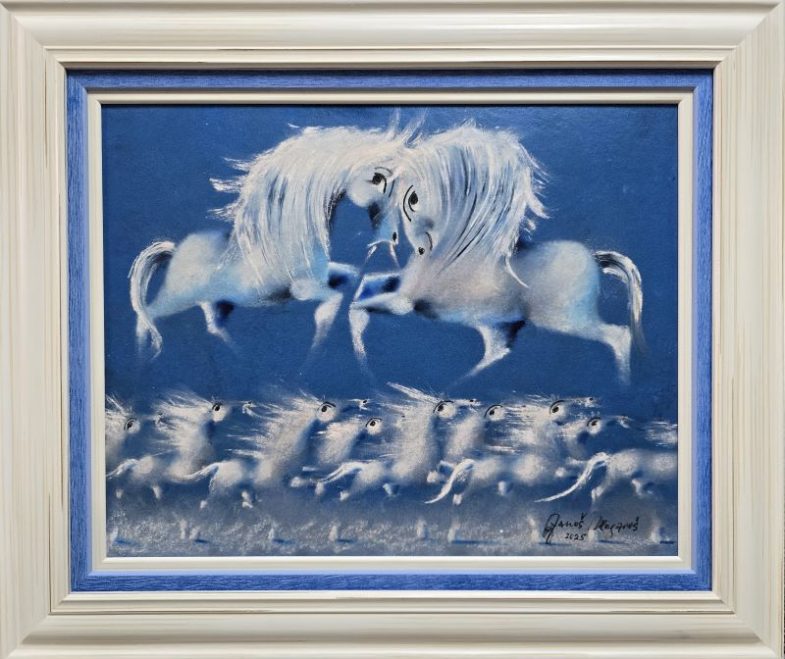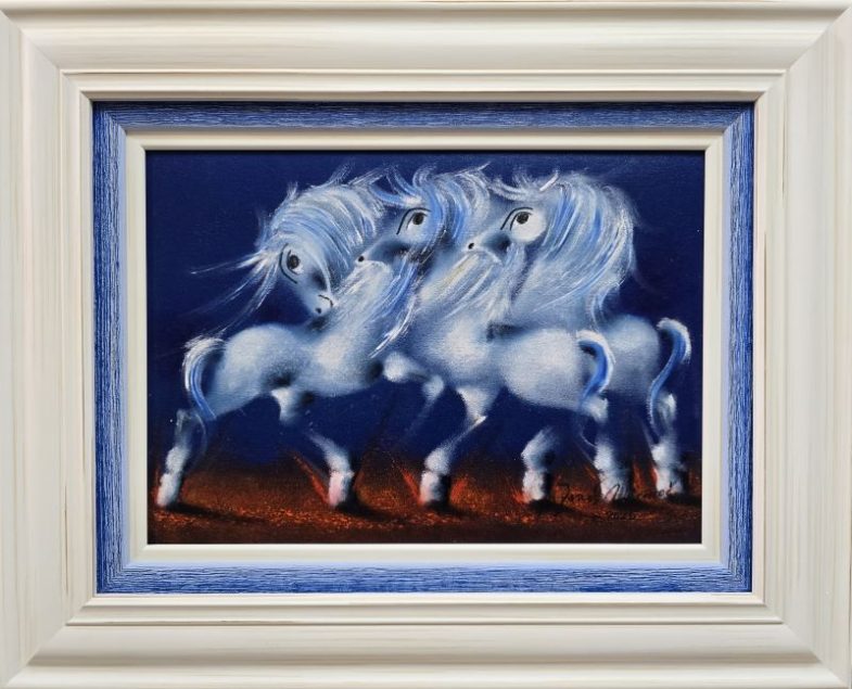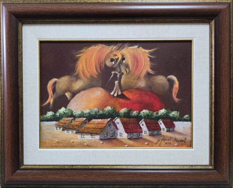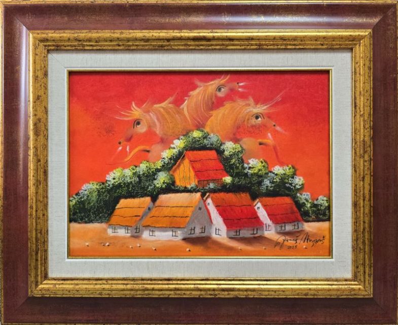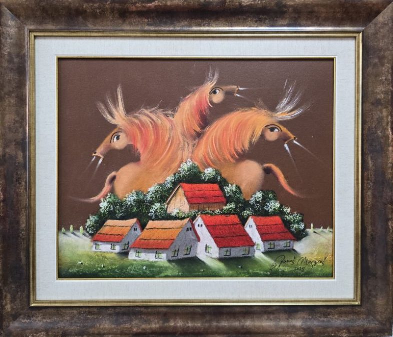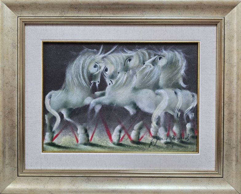 Igrali se konji, Janoš Mesaroš, kombinovana tehnika lak pastel, luksuzno uramljen, sa 41×51 cm, bez 25×35 cm, sertifikat, 29500 dinara
