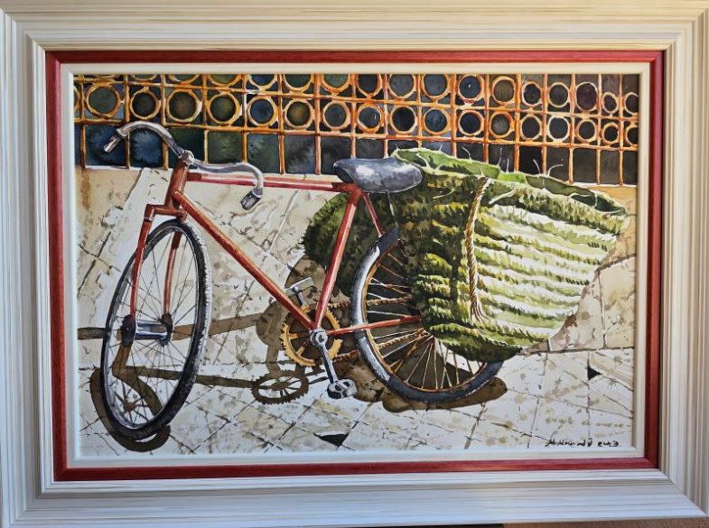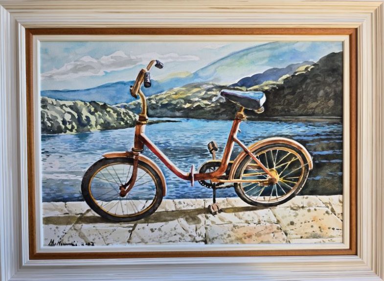 Bicikl, Momo Macanović, akvarel kaširan na lepenci, sa ramom 51×69 cm, bez 38×56 cm, sertifikat, 2023., 35400 dinara