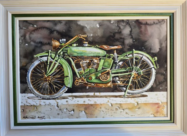 Motor, Momo Macanović, akvarel kaširan na lepenci, sa ramom 51×69 cm, bez 38×56 cm, sertifikat, 2023., 35400 dinara