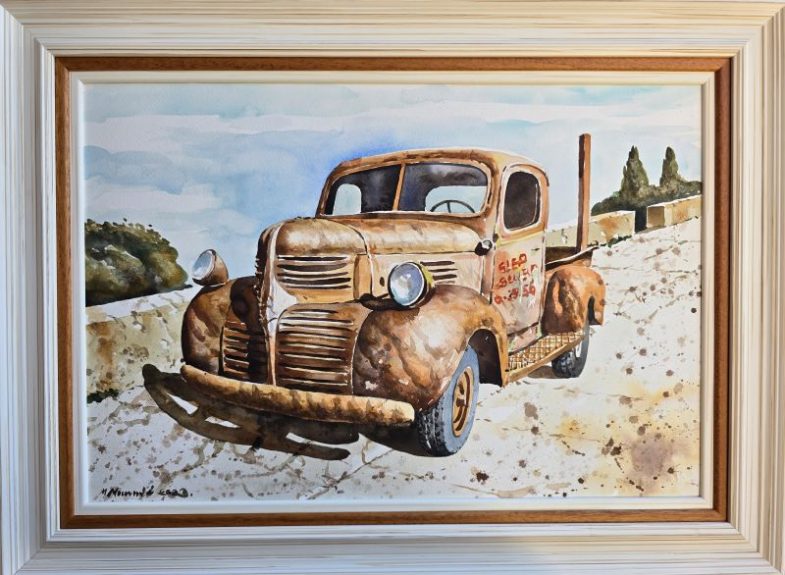 Stari kamion II, Momo Macanović, akvarel kaširan na lepenci, sa ramom 51×69 cm, bez 38×56 cm, sertifikat, 2023., 35400 dinara