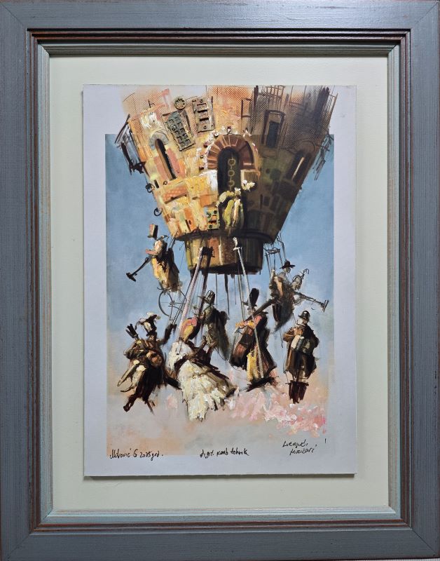 Lutajući muzičari, Goran Mitrović, bez rama 50×35 cm, sa ramom 71×56 cm, digitalna kombinovana tehnika sa dodatim aplikacijama i islikanim detaljima uljanom bojom, unikat slika, sertifikat, 47200 dinara
