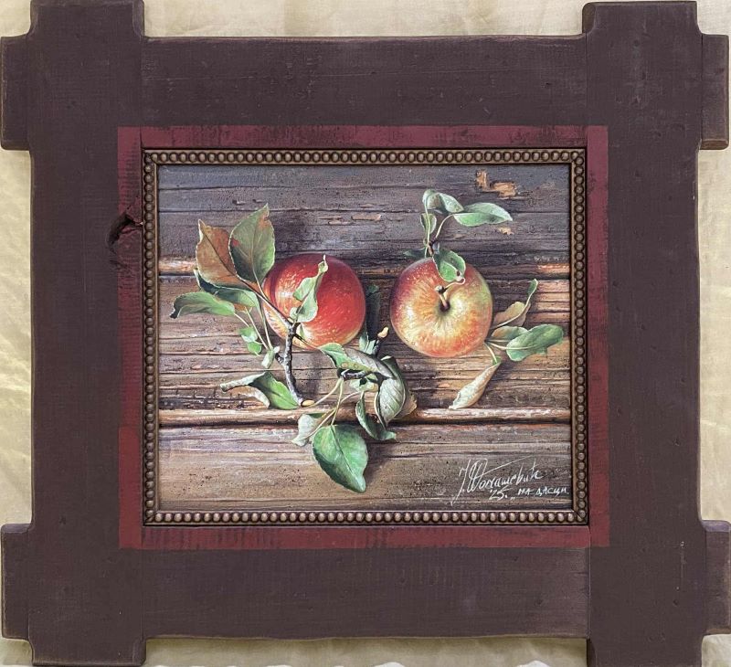 Umetnička slika „Na dasci“ autora Jovice Tomaševića oslikava jednostavnost i lepotu svakodnevnog života. Tehnika ulje na platnu kaširano na šperu daje bogatstvo teksture i dubinu boja, dok crvene jabuke na drvenoj dasci bude sećanja na mirisnu jesen i spokoj domaćeg ognjišta.