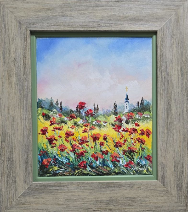 Polje makova, ulje na platnu, Vesna Cvetkov, sa 45×40 cm, bez 30×25 cm, uramljena, sertifikat, 9440 dinara
