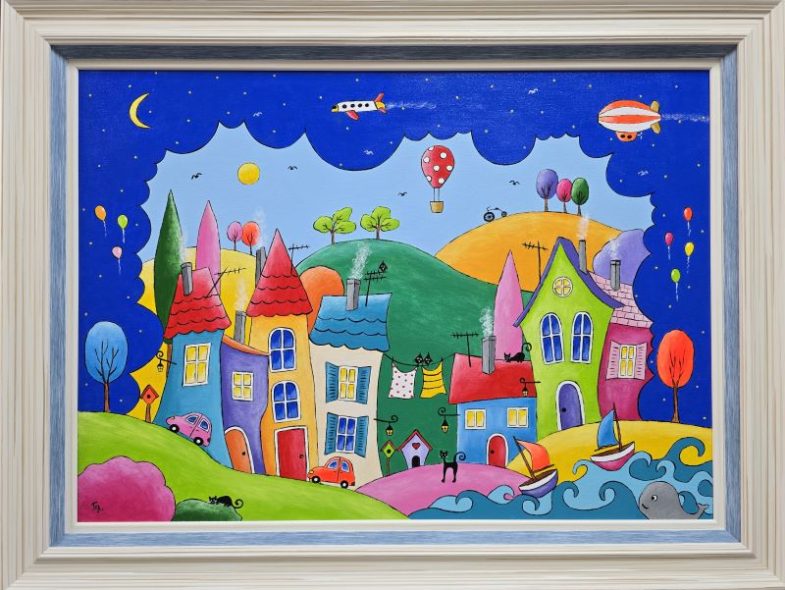Akril na platnu koji donosi eksploziju boja i optimizma. „Šaren grad“ prikazuje urbani pejzaž u najživljem obliku, gde se energija ulica pretvara u veselu, ritmičnu harmoniju tonova i oblika.